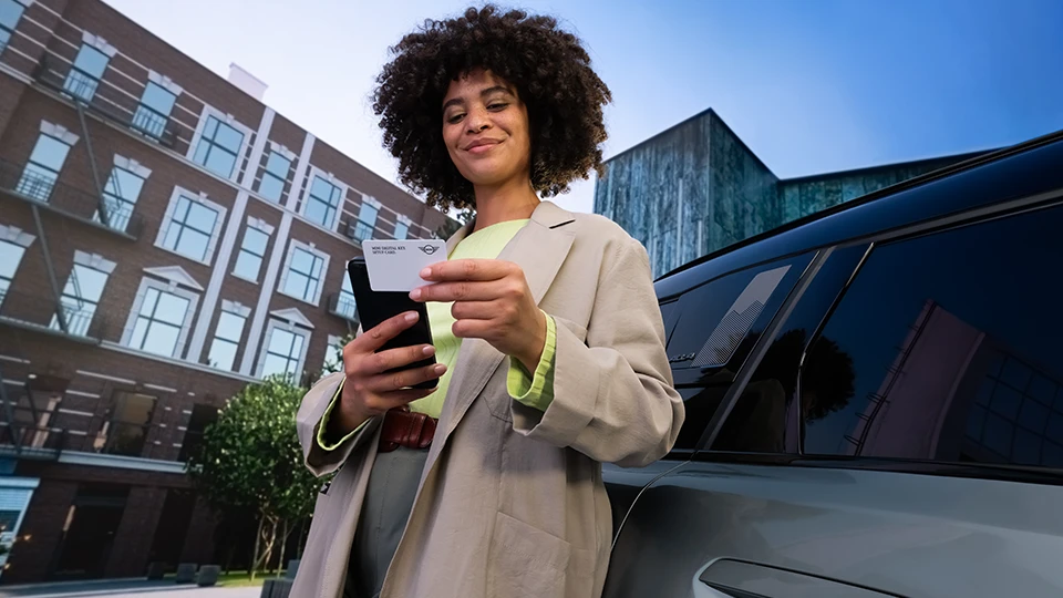 Priklausomai nuo konkrečios šalies, MINI 9 kartos operacinę sistemą turinčio MINI modelio ir įrangos, savo MINI galite atrakinti ir užvesti naudodamiesi su Teleservices (6AE) telepaslaugomis ir berakte automobilio atrakinimo sistema Comfort Access (322), su susietu MINI skaitmeniniu raktu Plus ir išmaniuoju telefonu arba laikrodžiu. Jeigu jūsų šalyje ir jūsų mobilusis įrenginys palaiko Ultra-Wideband ultraplačiajuostės (UWB) technologijos standartą, jūsų MINI automatiškai atsirakins jums priartėjus. Papildomos komforto funkcijos yra prieinamos naudojantis išmaniuoju telefonu, laikrodžiu ir MINI programėle. Norint užvesti variklį, tereikia turėti mobilųjį įrenginį automobilio salone. Jeigu UWB standartas nepalaikomas, duomenys yra perduodami naudojant Near Field Communication artimojo lauko ryšio technologiją (NFC). Tokiu atveju, norint užvesti variklį, išmanųjį telefoną arba laikrodį reikia palaikyti prie durelių rankenėlės ir padėti ant išmaniojo telefono laikiklio.