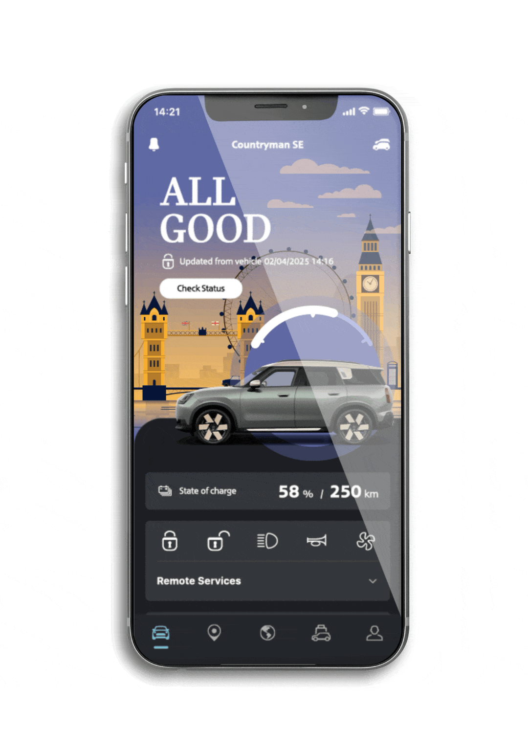 *MINI programėlė yra suderinama su visais nuo 2018 metų kovo pagamintais MINI modeliais. Kartu su ConnectedDrive paslaugomis, ja galite naudotis savo išmaniajame telefone. Tam, kad būtų užtikrintas geriausias programėlės veikimas, automobilis turi palaikyti nuotolinių paslaugų funkciją. Priklausomai nuo konkrečios šalies, MINI programėlės prieinamumas ir funkcijos gali skirtis.
